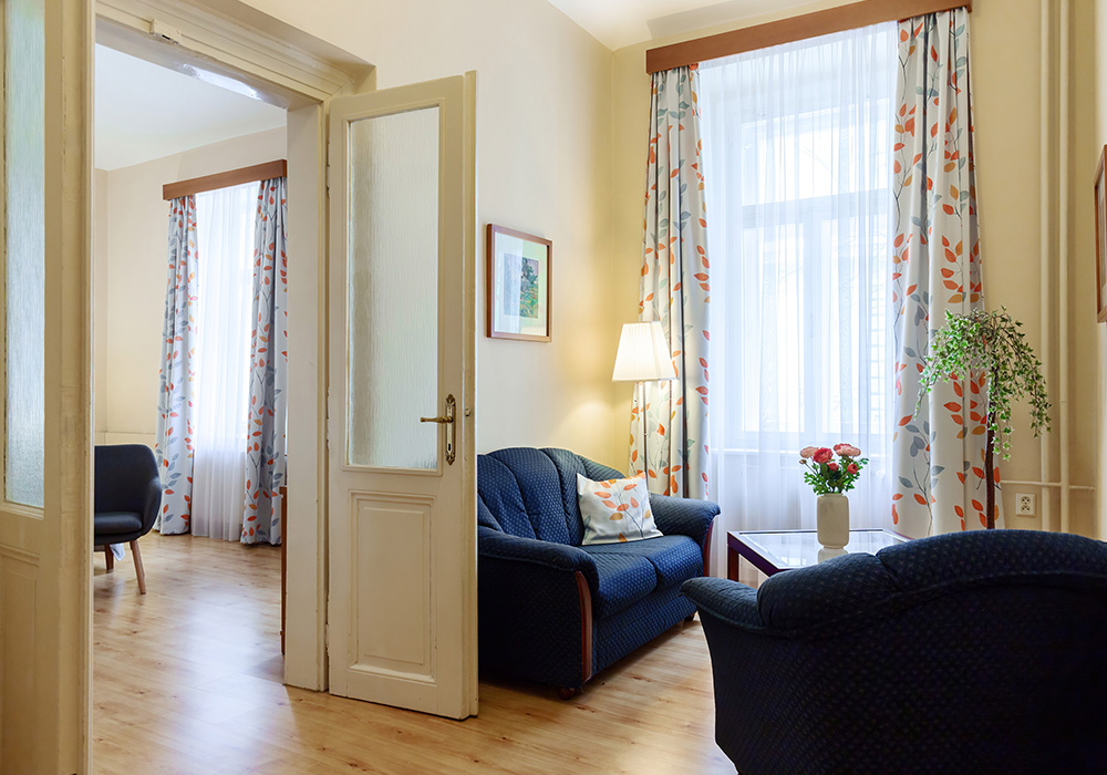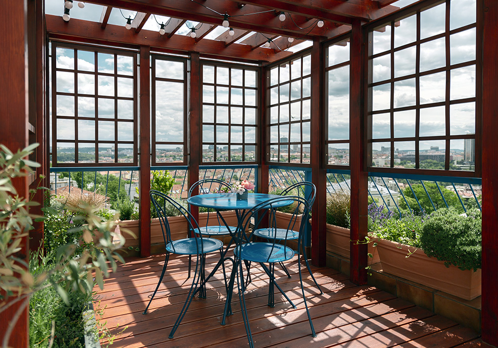 Využijte jedinečné možnosti online rezervace Střešního apartmánu s prostornou terasou a užijte si dechberoucí výhled na Prahu.